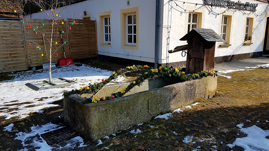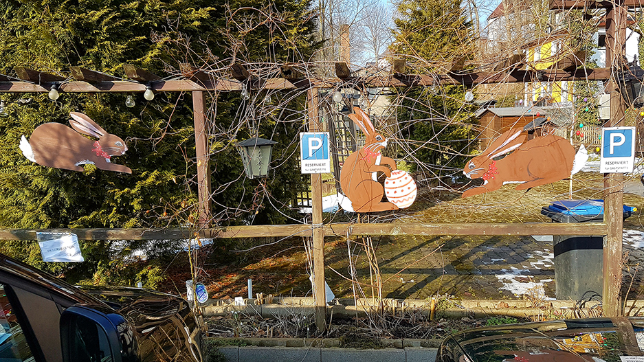 U.a. sind verschiedene Osterhasen, ein Osterbrunnen und einem Osterwagen zu entdecken.